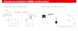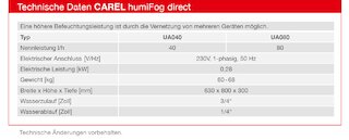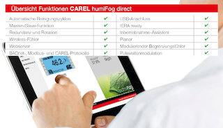 Dieses effiziente System ist einfach zu installieren und eignet sich auch für jedes noch so komplexe Umfeld. Reines Wasser wird in feinsten Nebel zerstäubt, der spontan in der Luft verdunstet und bei niedrigstem Energieverbrauch den richtigen Feuchtegrad sichert. Der CAREL humiFog direct garantiert hygienische Sicherheit, weil er nur vollentsalztes Wasser zerstäubt und die Leitungen automatisch