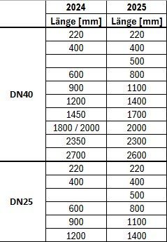 Bis zum Jahresende erhalten Sie noch die aktuellen Dampfverteiler. Ab 2025 erhalten Sie dann das angepasste und optimierte Portfolio. Eine Dampfverteiler-Übersicht der aktuellen und der zukünftigen Maße finden Sie im Anhang.