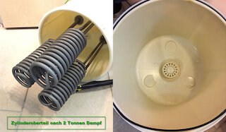 Die zwei Bilder des geöffneten Zylinders des Feldtestgerätes SLH15 und der 3 Heizkörper nach etwa 2 Tonnen produziertem Dampf bei ca. 2/3 Ø-Last sehen nahezu unbenutzt aus: