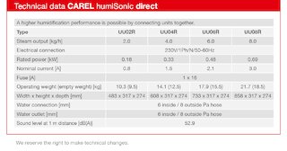CAREL humiSonic direct is operated with demineralised water. In addition all water-bearing components are made of stainless steel. In the humidifier housing no water accumulates at the end of the humidification cycle, and if the system is not working the stand-by blowdown ensures maximum hygiene.
