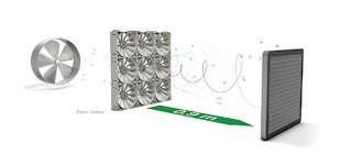 En outre, l'évaporation du fin brouillard refroidit le flux d'air dans le conduit et assure ainsi une refroidissement de l'air ambiant. Avec le refroidissement de l'air d'échappement en été, cela peut économiser jusqu'à ⅓ de la capacité de refroidissement requise afin d'obtenir une température ambiante agréable pour les employés et les clients. Également dans les usines de production la charge de refroidissement primaire peut être considérablement réduite en diminuant la chaleur résiduelle du processus.
